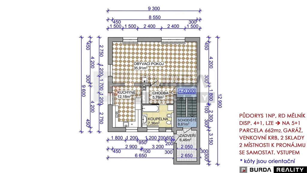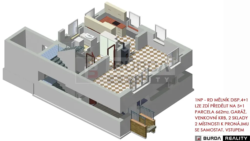 1.NP = zvýšené přízemí: zádveří, obývací pokoj s krbovými kamny Romotop, kuchyně, koupelna s WC.