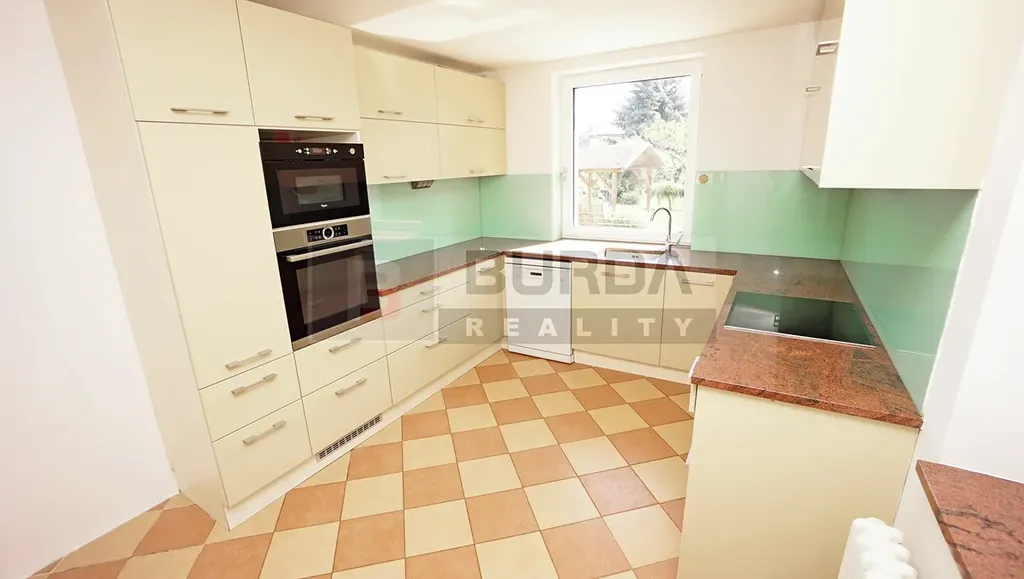 V kuchyni je kvalitní lakovaná kuchyňská linka na míru s žulovou deskou Multicolor, s nerezovým dřezem Franke s baterií. V lince je el. indukční deska Bosch, el. trouba Bosch, mikrovlnka Whirpool, volně vsazená myčka Miele (zůstane) a digestoř s odtahem. Obklad tvoří kombinace skla a lacobelu.