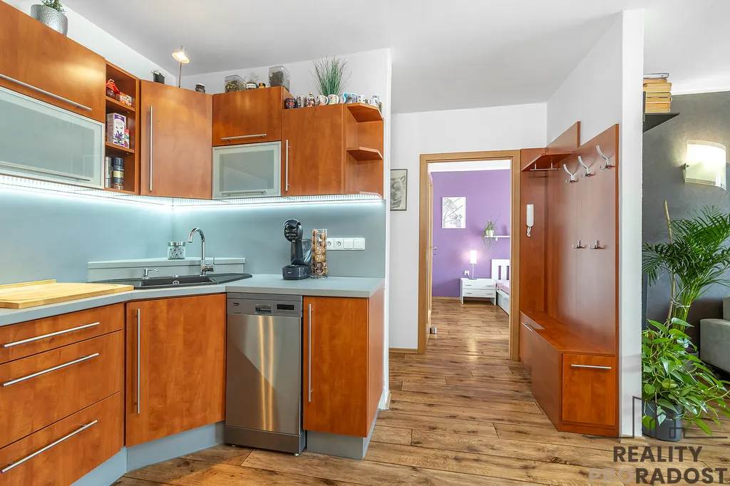 Dispozice je prakticky řešena – dominantou bytu je prostorný obývací pokoj s kuchyňským koutem a jídelní částí, dále ložnice se zasklenou lodžií o velikosti 3,4 m², samostatný pokoj, koupelna s rohovou vanou a toaletou.