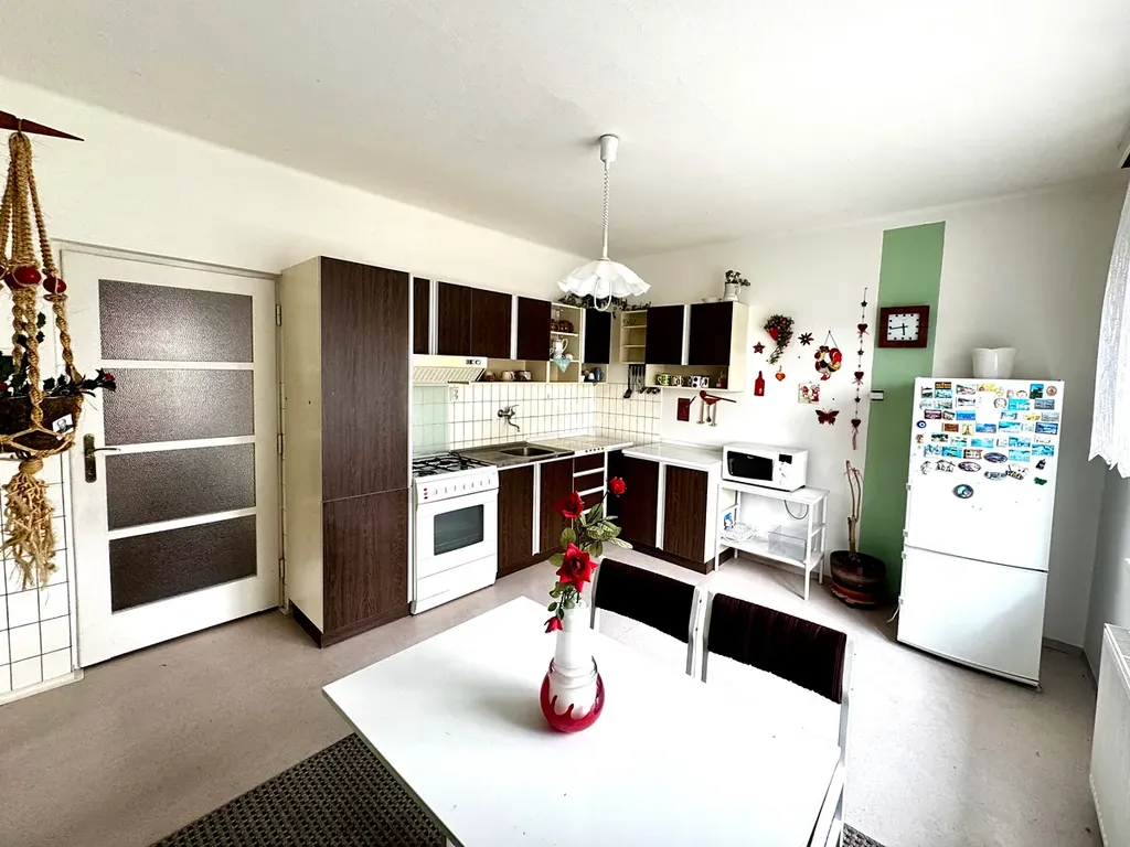Dům je zděný, kompletně podsklepený (včetně garáže), s užitnou plochou cca 130 m². Obytná část zahrnuje tři pokoje, kuchyň, koupelnu s wc, další samostatné wc, pracovnu a další prostory pro pohodlné bydlení. Sklepní prostory o ploše cca 90 m² poskytují dostatek místa pro dílnu, sklad i další využití.