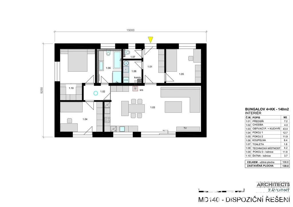 Dům MD140 je navržen jako komfortní bezbariérový bungalov vyšší kategorie s důrazem na prostor, funkčnost a kvalitní rodinné zázemí. Dominantou je velkorysý obývací prostor s kuchyňským koutem o velikosti 43,0 m² s dostatkem denního světla a přímým vstupem na terasu a zahradu. Klidová část domu nabízí tři samostatné pokoje (12,7 m², 11,9 m² a 11,9 m²), šatnu, koupelnu, samostatné WC a technickou místnost. Dispozice je navržena s důrazem na oddělení obytné a klidové části, minimální komunikační plochy a maximální využití prostoru.