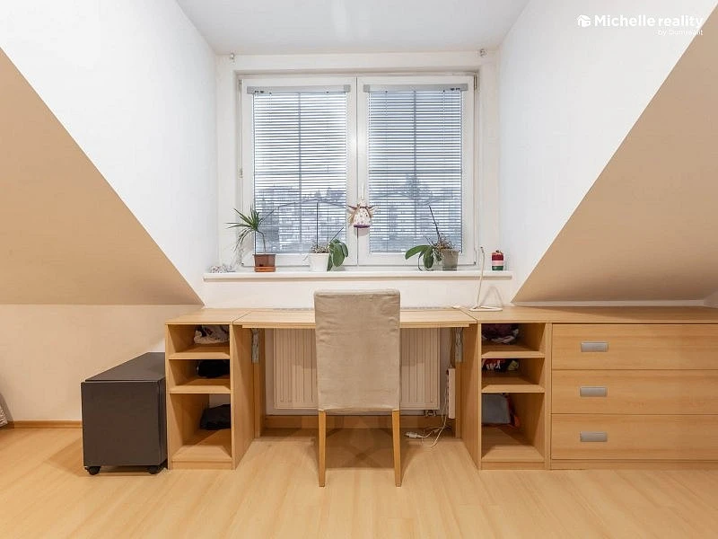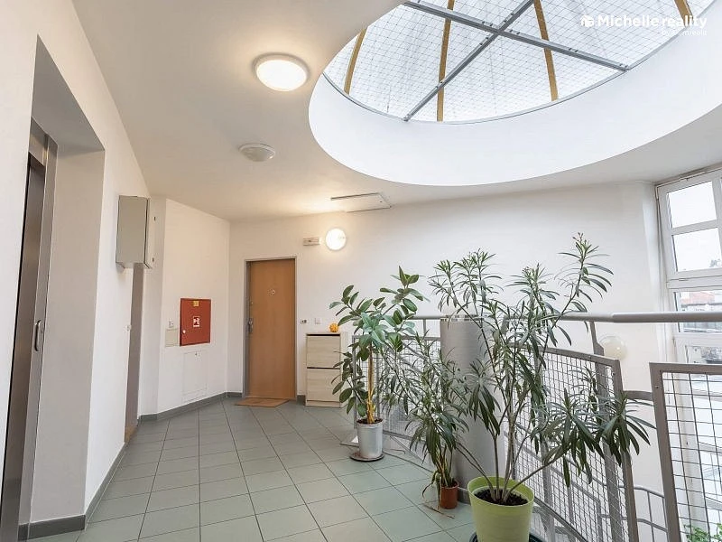 Michelle reality Vám zprostředkuje prodej krásného podkrovního bytu 2+kk v klidné ulici Na Sypkém v Libni. Byt disponuje užitnou plochou 62 m² v nejvyšším 6. nadzemním podlaží. Do vašeho budoucího bytu se dostanete pohodlně bezbariérově velkým výtahem a to jak z ulice, tak rovnou z garážového stání, které je součástí prodeje. Před bytem na stropu chodby je umístěna poloprůhledná střešní kopule, která nejen osvětluje celý prostor a je i skvělým a neobvyklým doplňkem interiéru domu. Vedle bytu na patře je umístěna velká sušárna prádla. Po vstupu do bytu Vás čeká větší chodba s vestavěnou skříní. Z chodby jsou samostatné vstupy do velkého obývacího pokoje s kuchyní a do ložnice. Oba prostory mají střešní okna a tedy poskytují větší soukromí a samozřejmě více přirozeného světla. Z chodby se dále vstupuje dvěma vchody do samostatného WC a do koupelny, ve které je nejen větší vana, ale která je zejména osvětlená střešním oknem, které slouží i k rychlému větrání. Kuchyň je nejen velká a vkusná, ale zejména je ve výborném stavu. Její hlavní dominantou je americká lednice. Podlahy v bytě jsou plovoucí, jen WC a koupelna jsou provedeny v kombinaci dlažby a obkladů. Velkou výhodou pro budoucího majitele bytu je možnost instalace venkovní klimatizační jednotky. Další výhodou je možnost zanechat kompletní vybavení bytu budoucímu majiteli Součástí prodeje je i garážové stání, které je umístěno u sloupu a tedy vymezuje širší prostor mezi auty. Poplatky a zálohy za služby spojené s užíváním bytu a garážového stání jsou nízké ve srovnání s byty v panelových domech. K bytu náleží sklep o velikosti 4 m², ke kterému se dostanete buď po schodech nebo výtahem, což je nejen výhodné, ale i pohodlné. S koupí bytu je dále spojeno i právo užívat další společné uzamykatelné prostory - kočárkárnu a kolárnu. Zajímavostí je, že dům disponuje recepcí, která momentálně plní funkci knihovny pro obyvatele domu. Místní SVJ se o dům řádně a pečlivě stará a všechny vzniklé problémy řeší neodkladně. K bytu dále náleží právo užívat společnou zahradu za domem, do které není vidět z ulice a tak je poskytnuto uživatelům téměř úplné soukromí. Umístění domu v Libni je opravdu skvělé, protože zastávka MHD je sice blízko na rušné ulici, avšak dům je od této rušné ulice zcela odstíněn. K nejbližším stanicím dvou linek metra se lze dostat do 7 - maximálně 10 minut. V okolí je k dispozici několik obchodů smíšeného zboží, mnoho restaurací, školka, základní škola a prestižní gymnázium. Další výhodou je možnost návštěvy plaveckého bazénu, samostatného venkovního koupaliště, divadla a tenisových kurtů. Nelze opomenout i možnost procházky do parku a nebo do Proseckých skal. Výhodou je i blízkost jedné z velkých pražských nemocnic. To vše je v dosahu 5 - maximálně 15 minut. Ev. číslo: 637403.