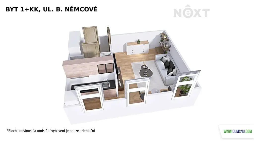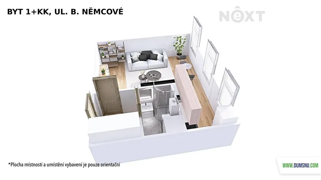 Dispozičně je byt řešen velmi prakticky – vstupní chodba s prostornou vestavěnou skříní plynule navazuje na hlavní obytný prostor s vkusně řešeným kuchyňským koutem. Samozřejmostí je koupelna se sprchovým koutem, toaletou a místem na pračku.