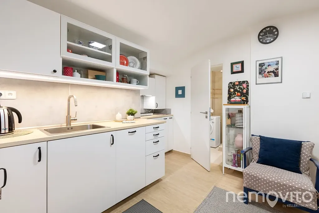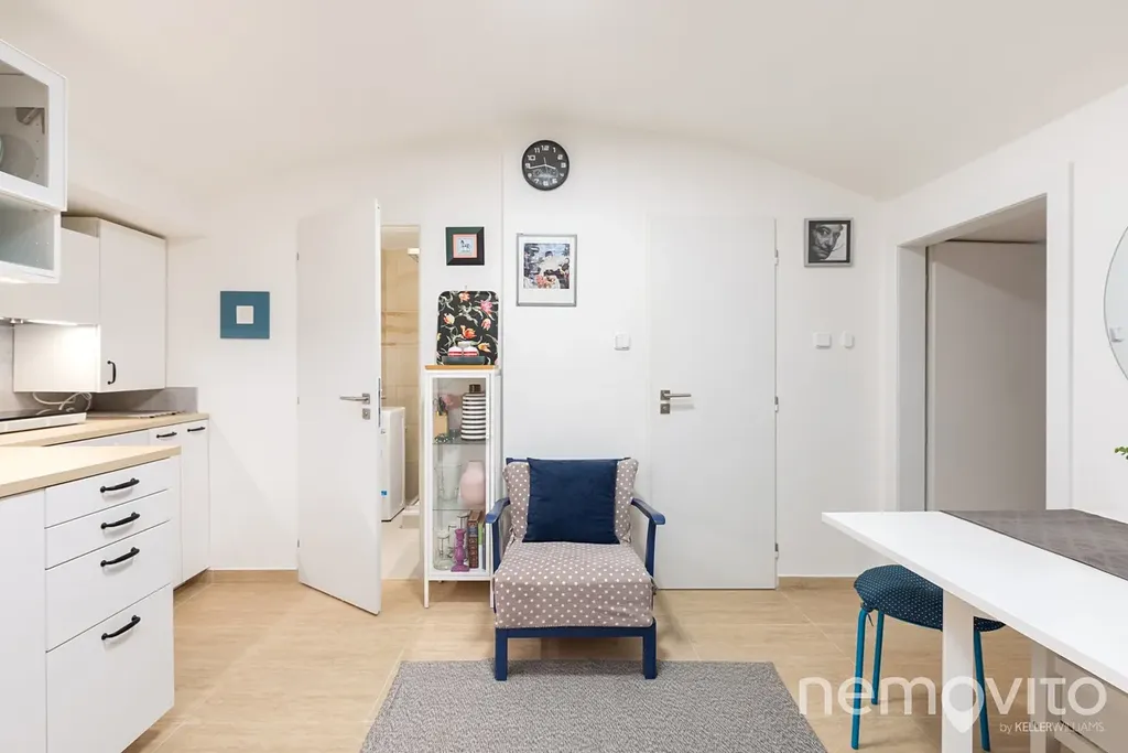 Místnost s kuchyní je aktuálně přepažena vytvořenou příčkou, která oddělila linku od vstupního zádveří. V něm je prostor na botník nebo šatnu. Vstup do obou pokojů je tak od sebe oddělen a nejsou průchozí. Koupelna je vybavena sprchou, WC je samostatně. Vytápění a ohřev vody je řešen elektřinou (bojler, konvektory - náklad 4.000 Kč měsíčně s kompletním provozem domácnosti).