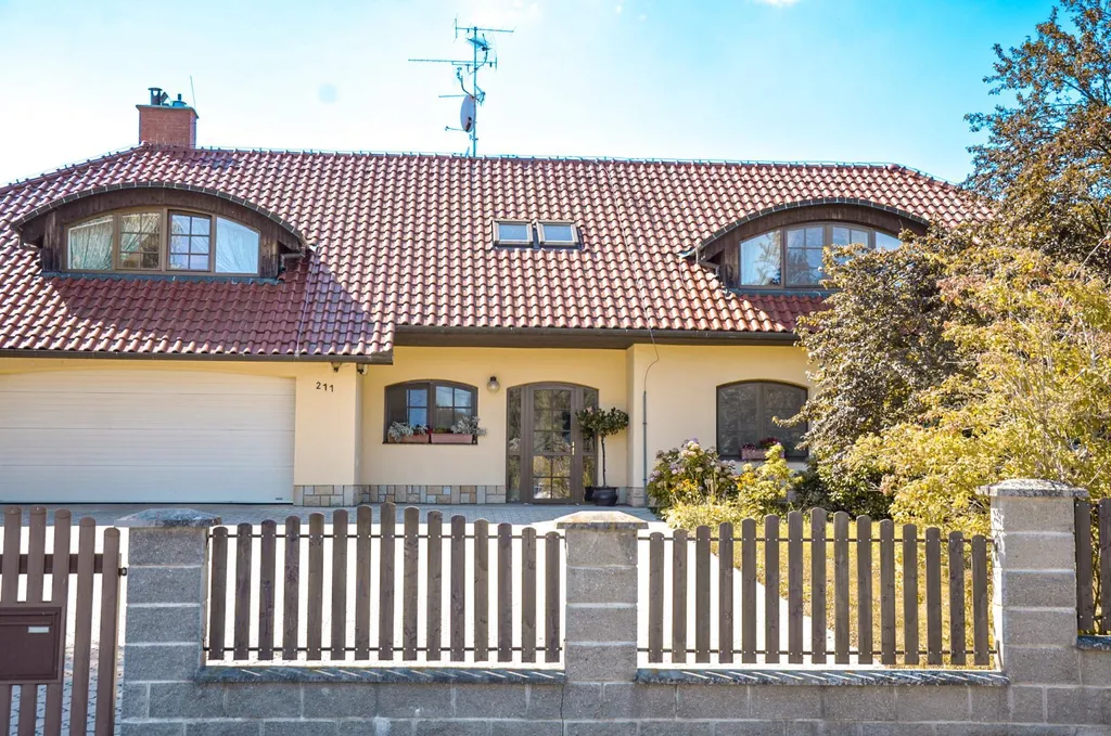 Vířivé vany v koupelnách, příprava na saunu, kondenzační plynový kotel, garážová vrata a brána na dálkové ovládání.