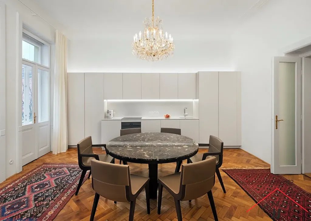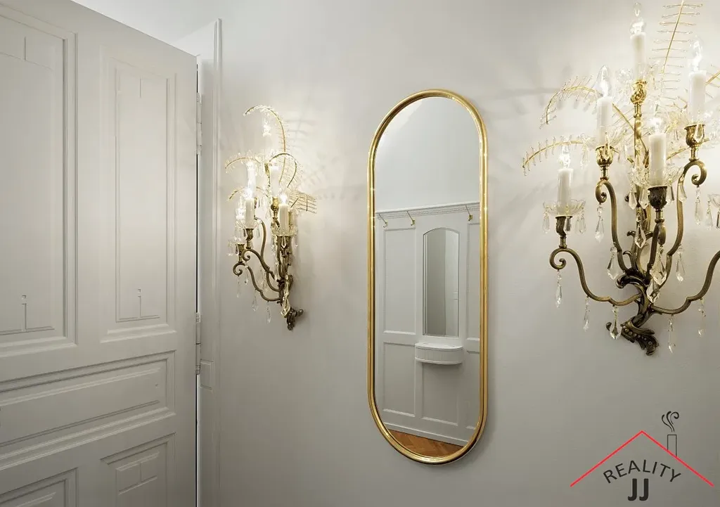 V bytě jsou parketové podlahy, štukové stropy a křišťálové lustry.