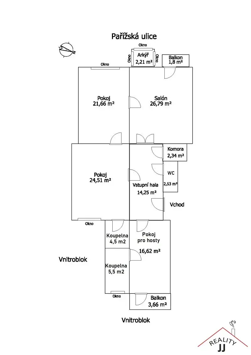 - obývací část (50 m2) dva propojené pokoje s balkonem
