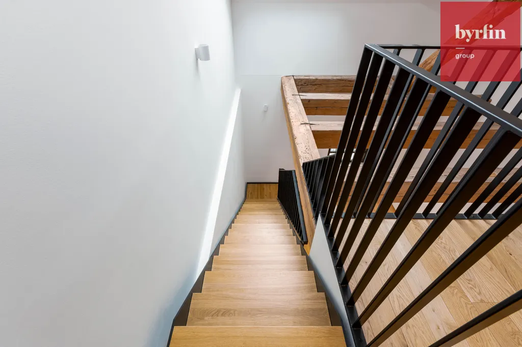 Rezidence je přístupná přes novou lávku a obchodní pasáž. Loftový byt, kde jsou zachovány původní dřevěné trámy, je dispozičně řešen jako 2+kk, 56 m2, v ceně je garážové stání a prostorná sklepní kóje.