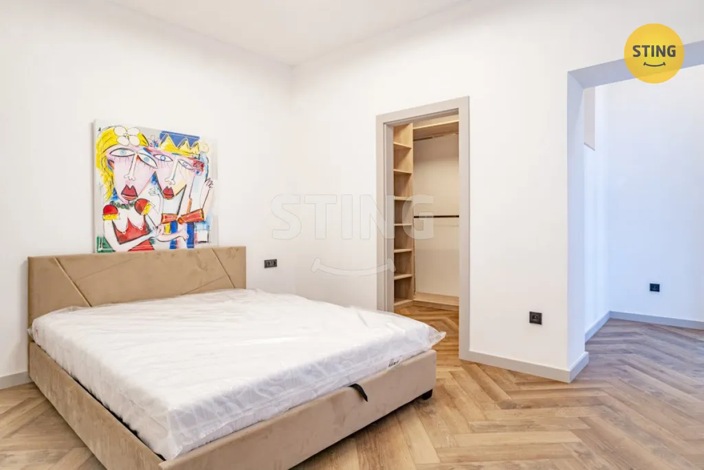 Interiér bytu je dokonale sladěn s důrazem na design a kvalitní materiály. Vinylová podlaha v parketovém vzoru působí elegantně a snadno se udržuje, čímž umocňuje pocit luxusu a pohodlí. Kuchyň je plně vybavena moderními spotřebiči a poskytuje dostatek prostoru pro přípravu pokrmů, zatímco prostorná šatna a ložnice vám zajistí maximální komfort a úložné možnosti. Pracovna je ideální pro domácí kancelář nebo studium, a to i díky dostatku přirozeného světla.