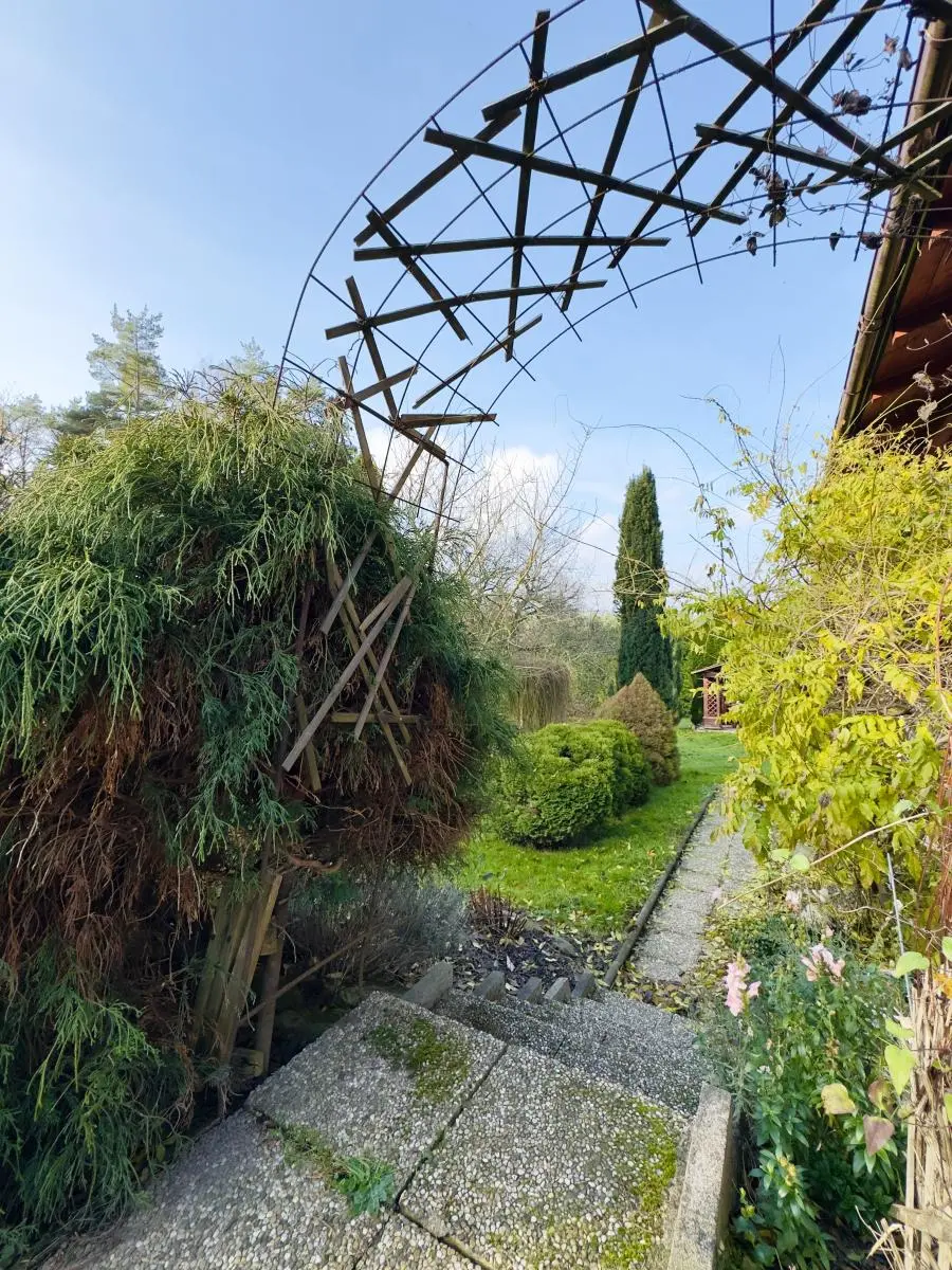 Rozlehlá zahrada o výměře 2 776 m nabízí vzrostlé stromy a okrasné keře, altánek, nový dřevěný skleník, vlastní lesík a okrasný rybníček se skalkou a molem.