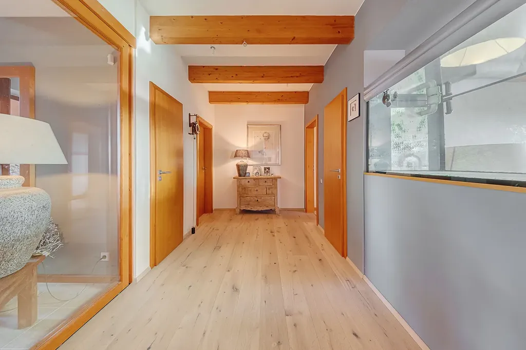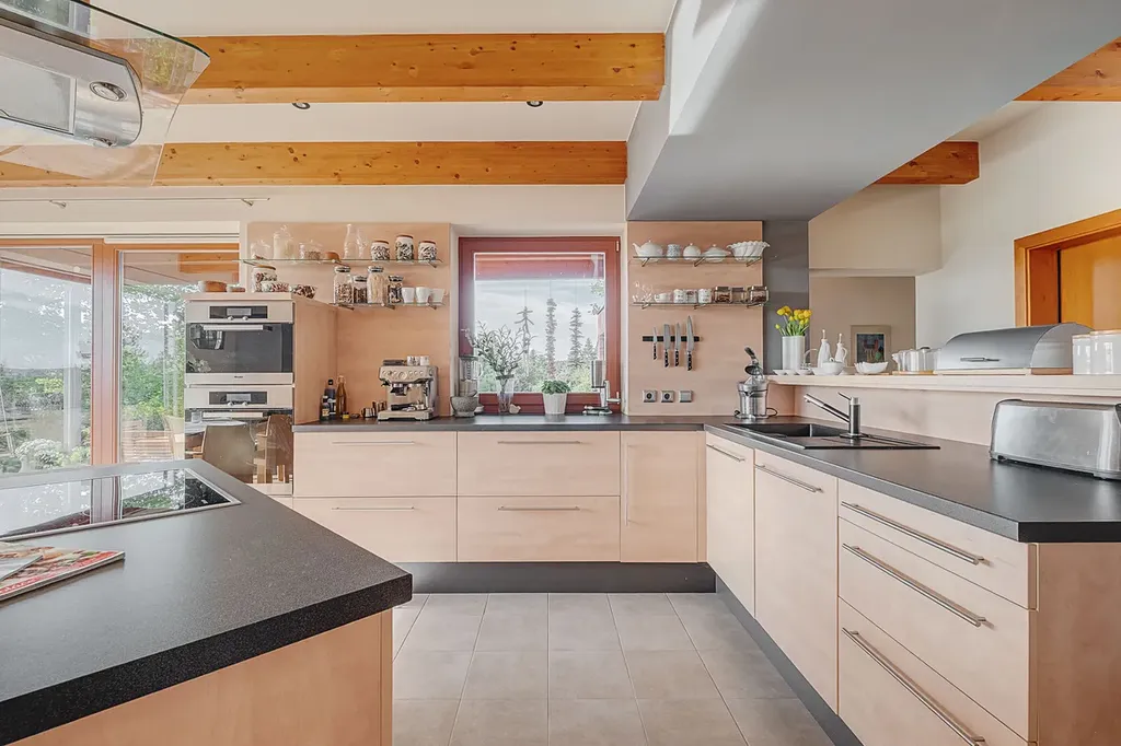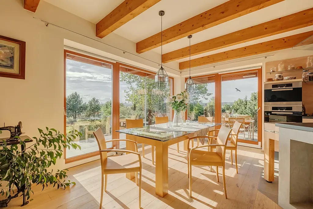 Srdcem domu je veliký obývací pokoj spojený s jídelním a kuchyňským koutem. Dostatek světla zajišťují velkoformátová okna směřující na jihozápad, poskytují uklidňující pohled do překrásné zahrady i ničím nerušený výhled v úhlu 180 ° na brdské lesy. Pocit prostoru a vzdušnosti dodávají také některé prosklené dveře. Součástí obývacího pokoje je velké akvárium. I když jste uvnitř domu, cítíte se spojeni se zahradou a okolní, krásnou přírodou.