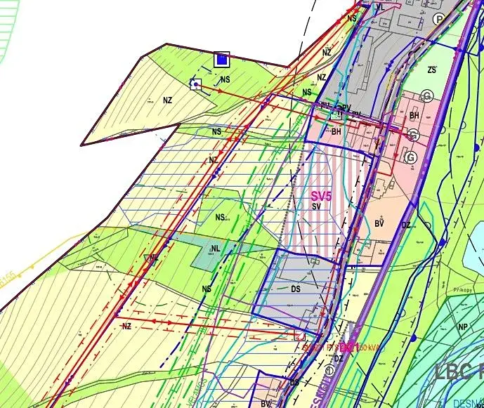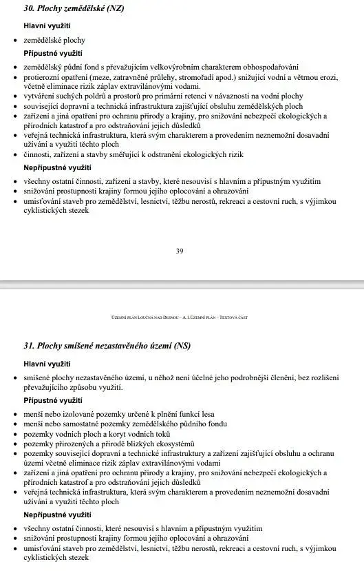 Pozemek je dále v platném územním plánu obce v části označen jako NZ – plochy zemědělské a NS – plochy smíšené nezastavěného území. Mimo ÚP travní plocha cca 25.368m2.