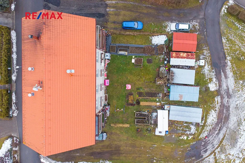 Dispozice bytu je velmi praktická a přehledná – vstupní chodba, koupelna, samostatné WC, kuchyně s jídelnou, dětský pokoj, obývací pokoj a ložnice s přímým vstupem na lodžii, která je navíc vybavena posuvnou skleněnou stěnou a lodžie tak nabízí příjemné místo pro ranní kávu nebo večerní klid v jakémkoli počasí. Velkou výhodou jsou také tři prostorné vestavěné skříně, které poskytují dostatek úložného prostoru bez nutnosti dalších kusů nábytku. K bytu náleží dva sklepy, vlastní kousek společné zahrádky a plechová garáž (15 m²), což je kombinace, která se u bytů objevuje jen zřídka a výrazně zvyšuje komfort bydlení.