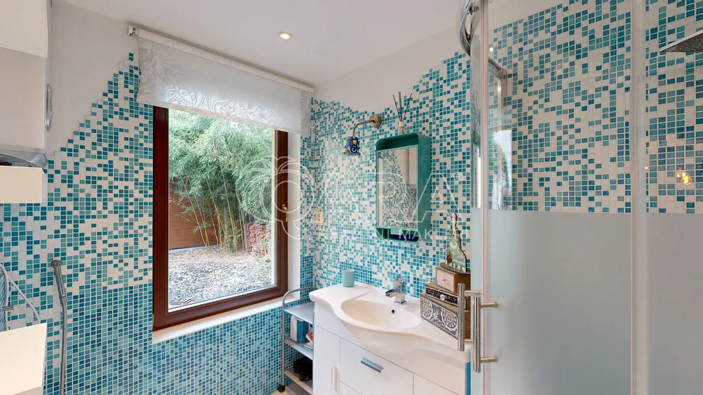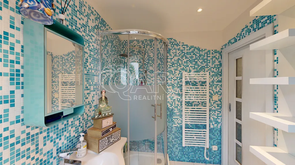 Ručně vyráběné mozaiky v kuchyni i na parapetech, práce se dřevem, krbová kamna, promyšlené detaily, které nepůsobí okázale, ale přirozeně. Velkorysá knihovna, chytré úložné prostory, světlo proudící do dvorního ticha – všechno dohromady vytváří harmonii, která se dnes hledá jen těžko.