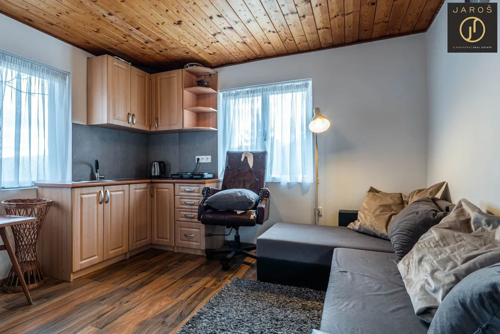 Chata o zastavěné ploše 17 m² je řešena ve dvou podlažích. V přízemí se nachází WC, sprcha a sauna s eleketrickými kamny, které vytvářejí ideální zázemí pro odpočinek. V horním podlaží je obytný pokoj s kuchyňským koutem. Objekt je napojen na elektřinu 230V, přívod ale umožňuje případně rozříření na 400V, voda z vodovodního řádu je k dispozici celoročně - nevypíná se sezóně. Vytápění je zajištěno kamny na tuhá paliva, o ohřev vody se stará elektrický boiler.