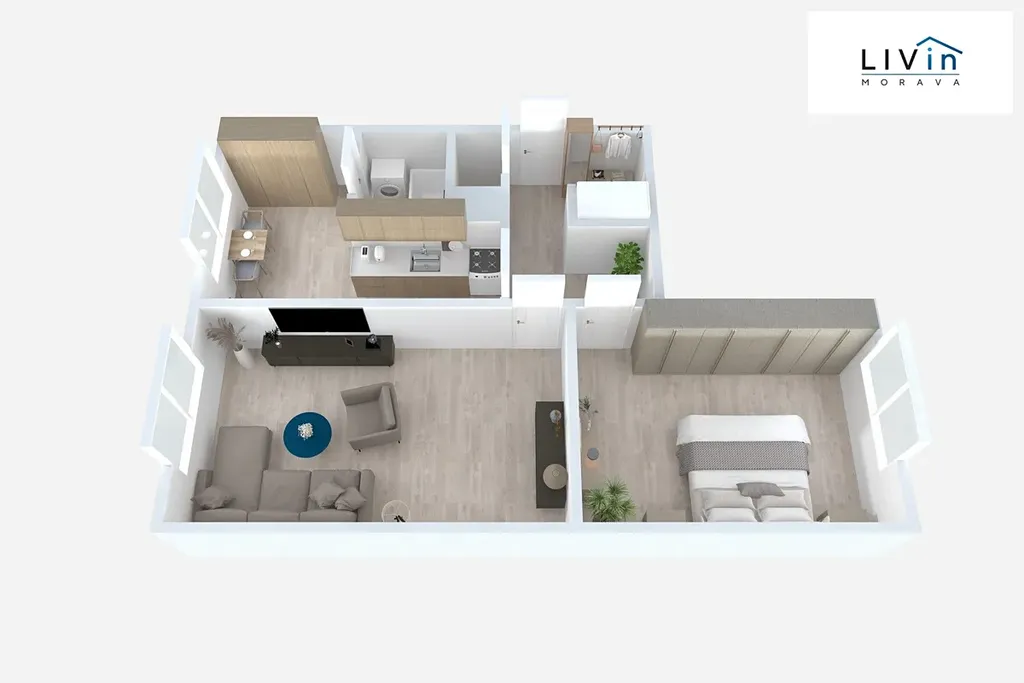 Kuchyň je vybavena kuchyňskou linkou, kombinovanou troubou se sklokeramickou varnou deskou, lednicí s mrazákem, mikrovlnnou troubou, jídelním stolem a židlemi. V koupelně se nachází vana, umyvadlo a pračka. Obývací pokoj je vybaven TV stěnou, komodou a konferenčním stolkem, případně je možné ponechat i dvě křesla a kobereček. V ložnici je k dispozici komoda a šatní skříň. Na chodbě se nachází další šatní skříň, věšák a zrcadlo. Ve všech oknech jsou instalovány vnitřní žaluzie a také záclony.