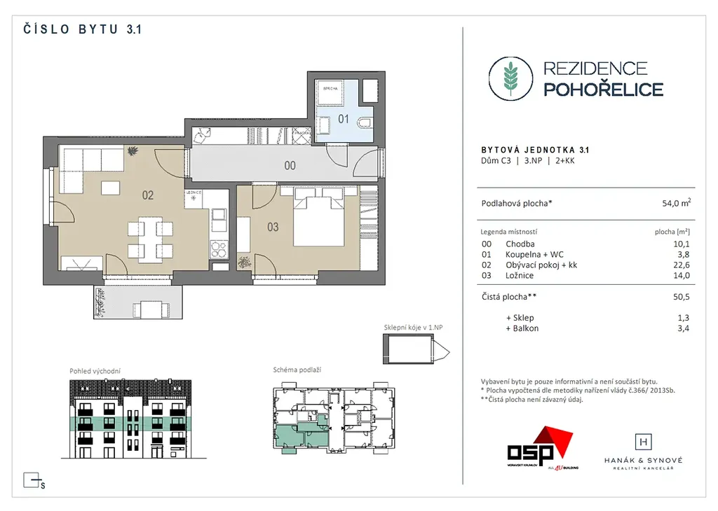 K dlouhodobému pronájmu Vám nabízíme nový, krásný, světlý, moderní byt v OV 2+kk v novostavbě bytového domu C3 Rezidence Pohořelice, na ulici U Kasáren 1089. Byt o ploše 54,0 m2 s balkonem (3,4 m2) je umístěn ve 3.NP čtyřpodlažního domu s velkorysými společnými prostory s výtahem.