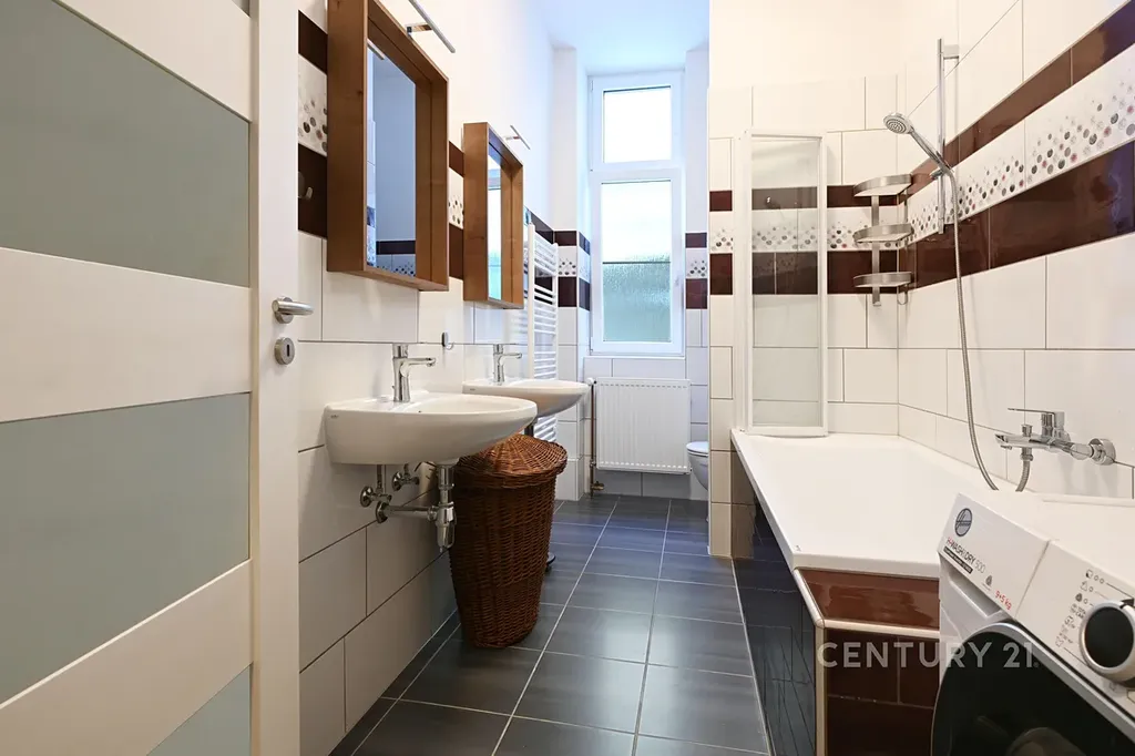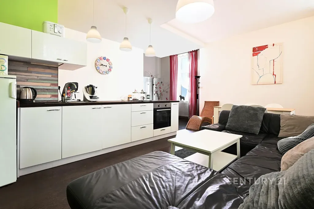 Obývací pokoj je propojen s kuchyňským koutem, který je vybaven lednicí, troubou, mikrovlnnou troubou a varnou deskou. K dispozici je také prostorná samostatná ložnice a koupelna s vanou se zástěnou a pračka se sušičkou, kterou je možné odkoupit od současných nájemců.