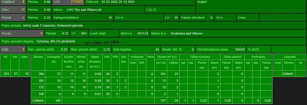 - p.č. 170/4 vedená jako lesní pozemek o celkové výměře 1 120 m2 (stáří lesa 34 let - zastoupení dřevin smrk, bříza, topol, dub)