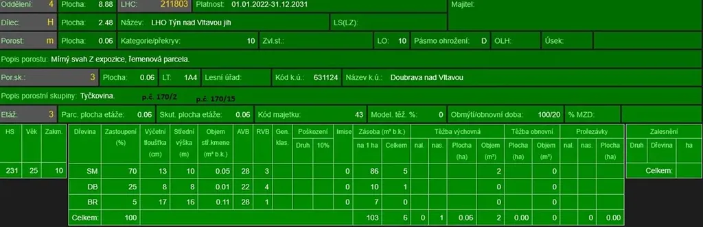 - p.č. 170/15 vedená jako lesní pozemek o celkové výměře 10 m2 (stáří lesa 28 let - zastoupení dřevin smrk, dub, bříza)