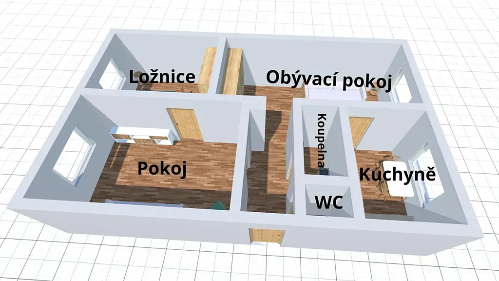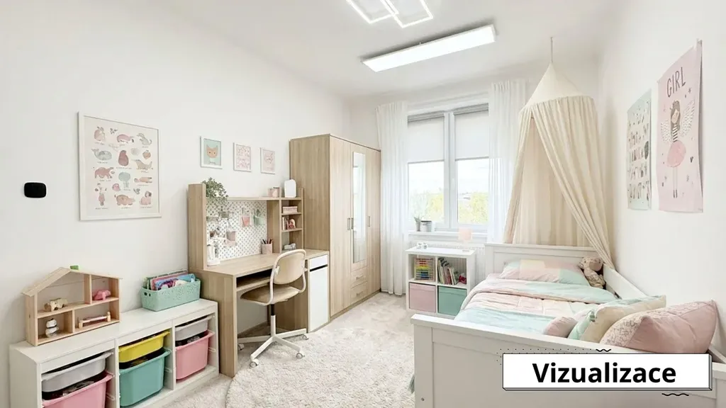 Dispozice bytu umožňuje jednoduchou úpravu na tři neprůchozí pokoje, což výrazně zvýší komfort bydlení. Pro rodiny s dětmi se nabízí možnost vytvořit z velkého pokoje prostorný dětský pokoj pro dva sourozence s dostatkem místa pro hraní i učení. Nový vchod do ložnice lze vybudovat z obývacího pokoje vedle plynového kotle, čímž vznikne soukromá neprůchozí ložnice. Kuchyň pak můžete propojit s částí chodby a vytvořit příjemnou jídelnu nebo pracovní koutek.