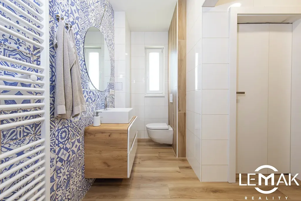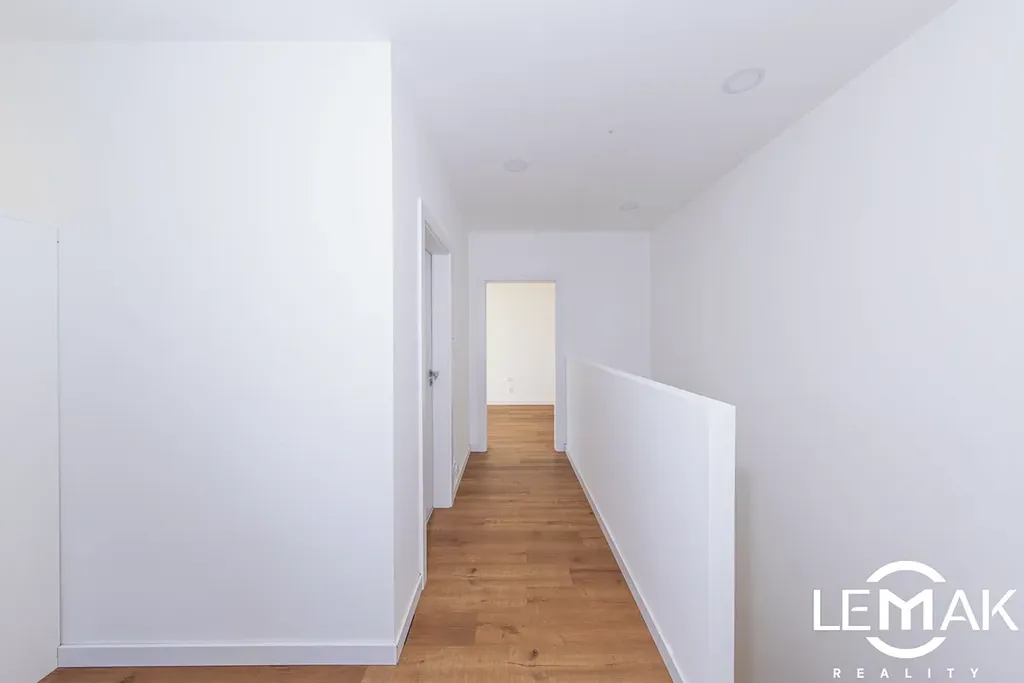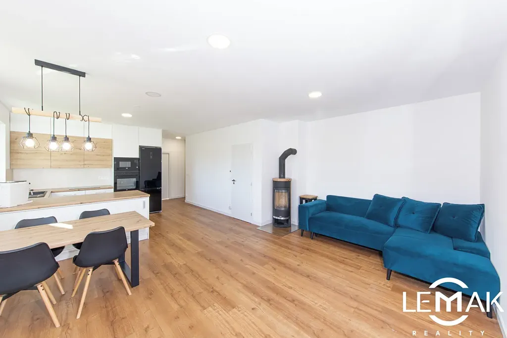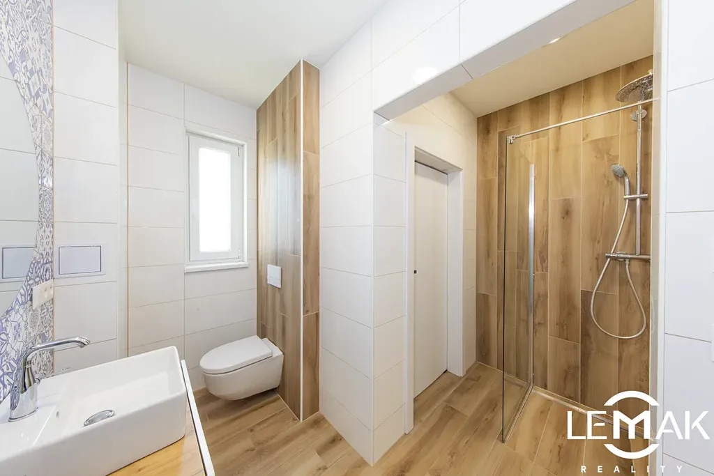 Interiér je laděn do teplých, příjemných tónů. Podlahy tvoří kvalitní vinyl s křemičitým jádrem, který má výborné vlastnosti pro podlahové vytápění.