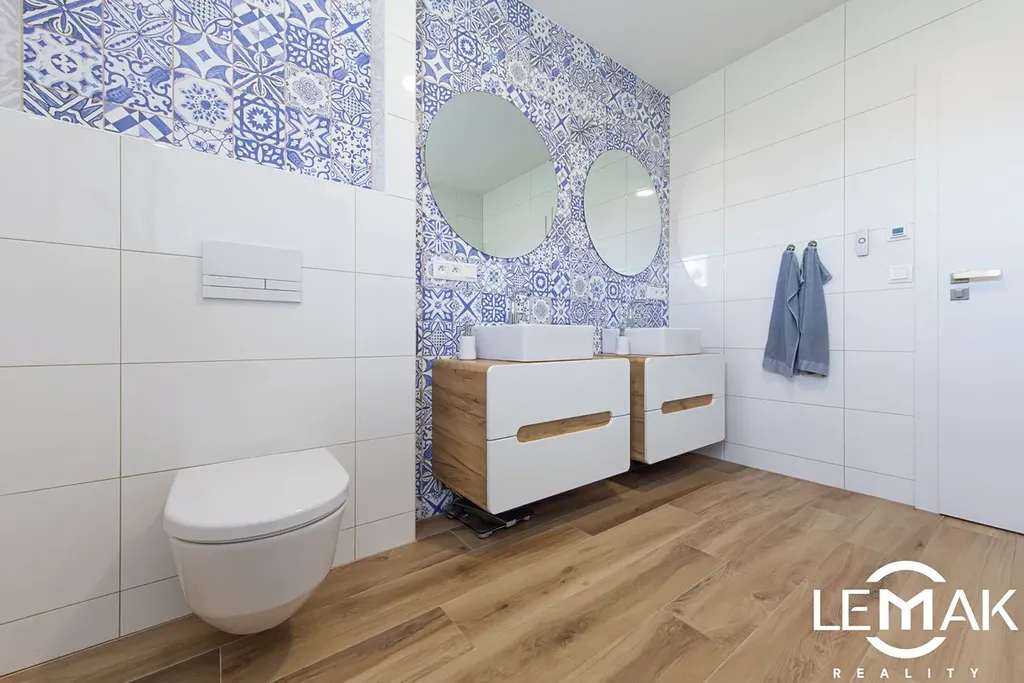 Osvětlení značky Eglo a italská keramika v koupelnách dodávají prostoru elegantní vzhled.