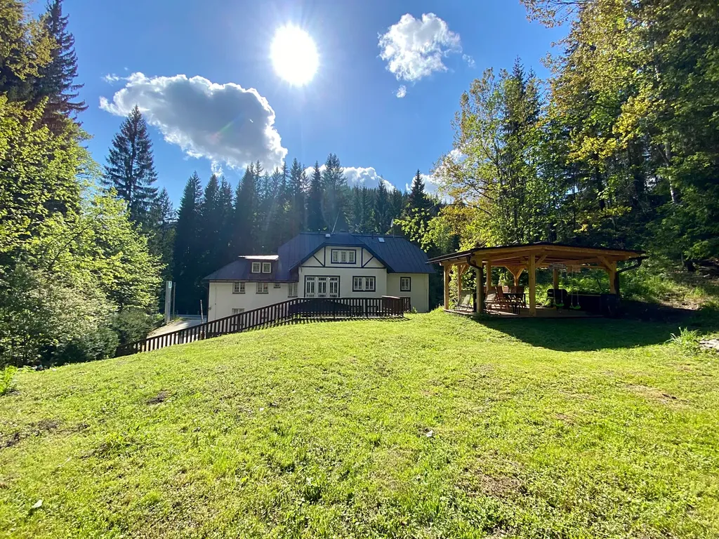 společenská místnost s barem, krbem a kulečníkem, sauna s odpočívárnou, lyžárna se sušákem na boty, zahrada s altánem k posezení