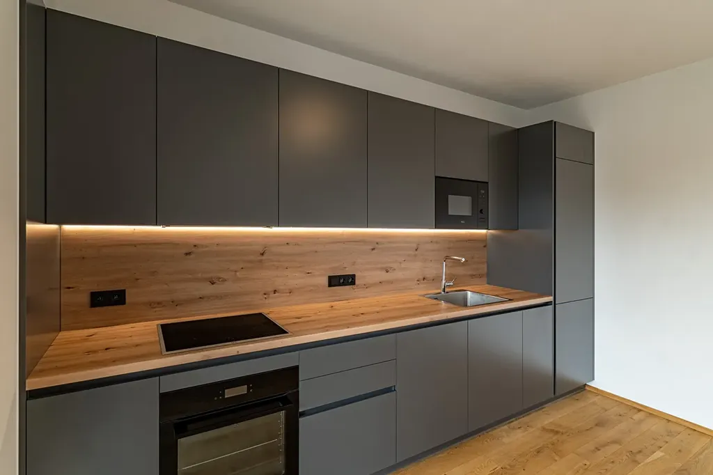- moderní kuchyňská linka s vestavěnými spotřebiči (trouba, varná deska, myčka, lednice)