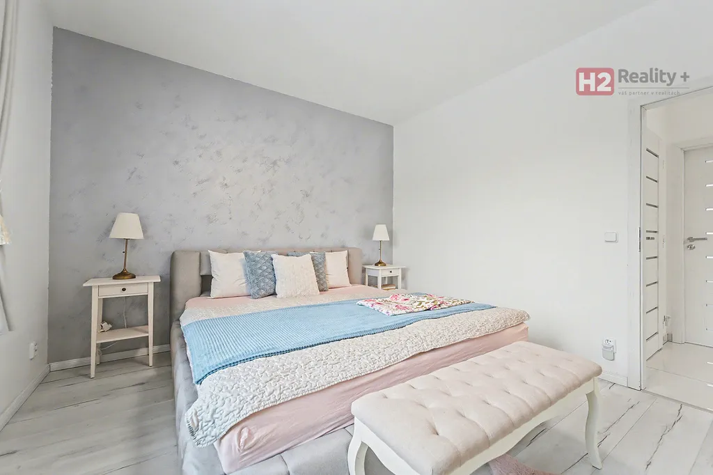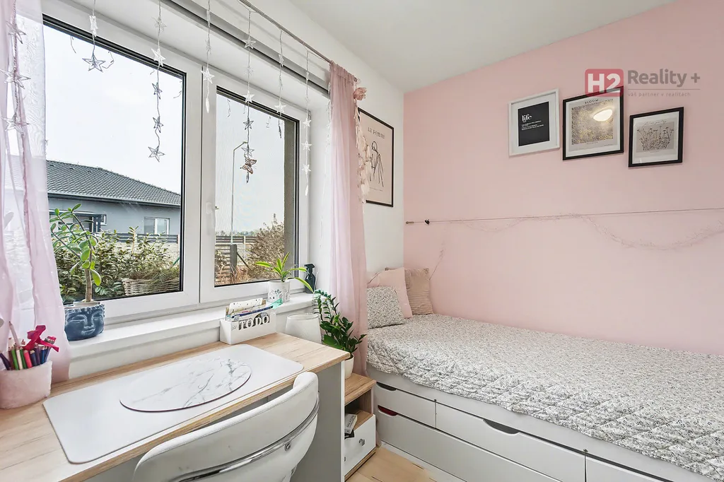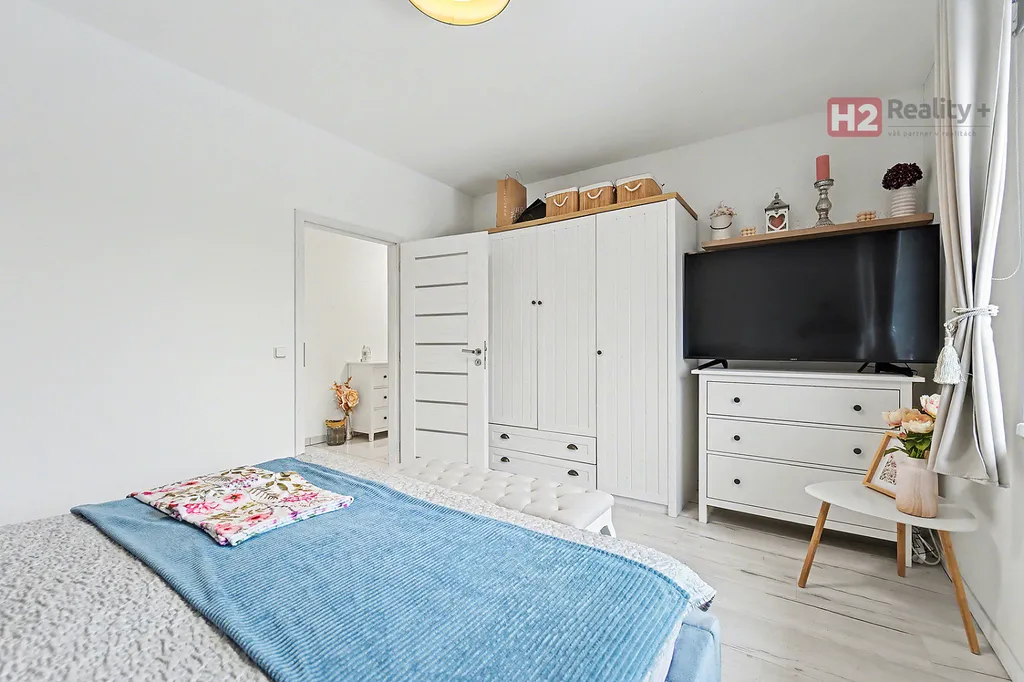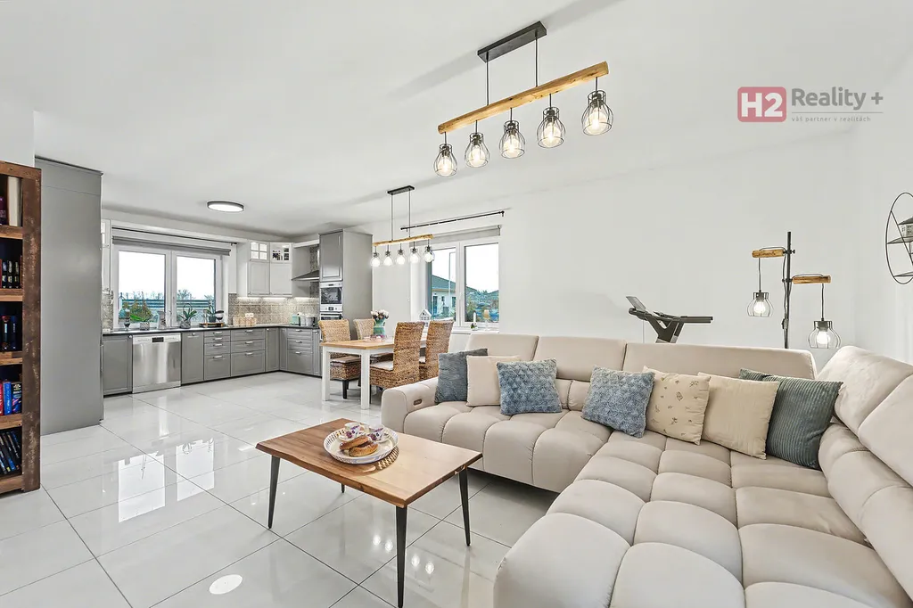 Centrem celého domu je velký a prosvětlený obývací pokoj (31 m²) spolu s prostorem pro kuchyň (12 m²) , z ob. pokoje snadný vstup na zahradu francouzským oknem, velkorysé řešení dispozice této části domu - umožňuje umístit sedací soupravu i jídelní část, kuchyň kompletně IKEA, navržena a vyrobena dle náročných požadavků klienta, velké množství odkládacích ploch, včetně spíže, veškeré spotřebiče ve vysoké kvalitě, díky oknu i skvělá světlost kuchyně, obývací pokoj a kuchyň osazeny dlažbou (velkoformátová SIKO), zbytek místností disponuje kvalitní plovoucí podlahou, Další tři místnosti mají samostatné vstupy, využívány jako ložnice a dětský pokoj (rozmístění již bude na nových uživatelích), možnost využívat plnohodnotnou koupelnu s toaletou, u vchodu ještě menší toaleta s umyvadlem, velkým benefitem je praktická šatna (4 m²). V celém domě podlahové topení, bezpečnostní systém AJAX, možnost napojit na bezpečnostní službu, vytápění a ohřev vody přes tepelné čerpadlo,