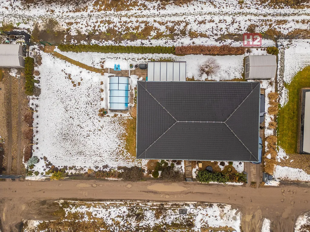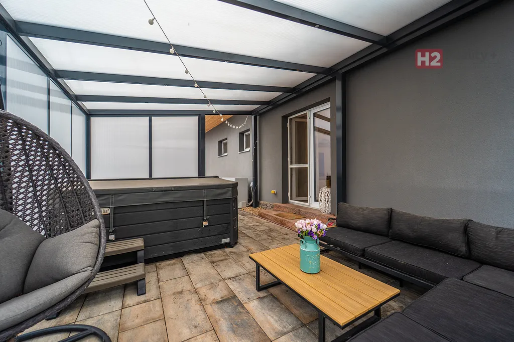 Dispozice domu 4+kk + technická místnost + krytý venkovní prostor k sezení, podlahová plocha 125 m² na pozemku o výměře 765 m², pozemek zatravněný, je k dispozici krytý bazén se slanou vodou (filtrační zařízení uloženo v zemi) a samostatně stojící domek na uskladnění zahradní techniky a nářadí. Stavební materiál cihla a tvárnice, kolaudace rok 2021 - prodává první majitel. V celém domě použity velmi kvalitní materiály, pečlivě vybíráno k maximálnímu uživatelskému pohodlí.
