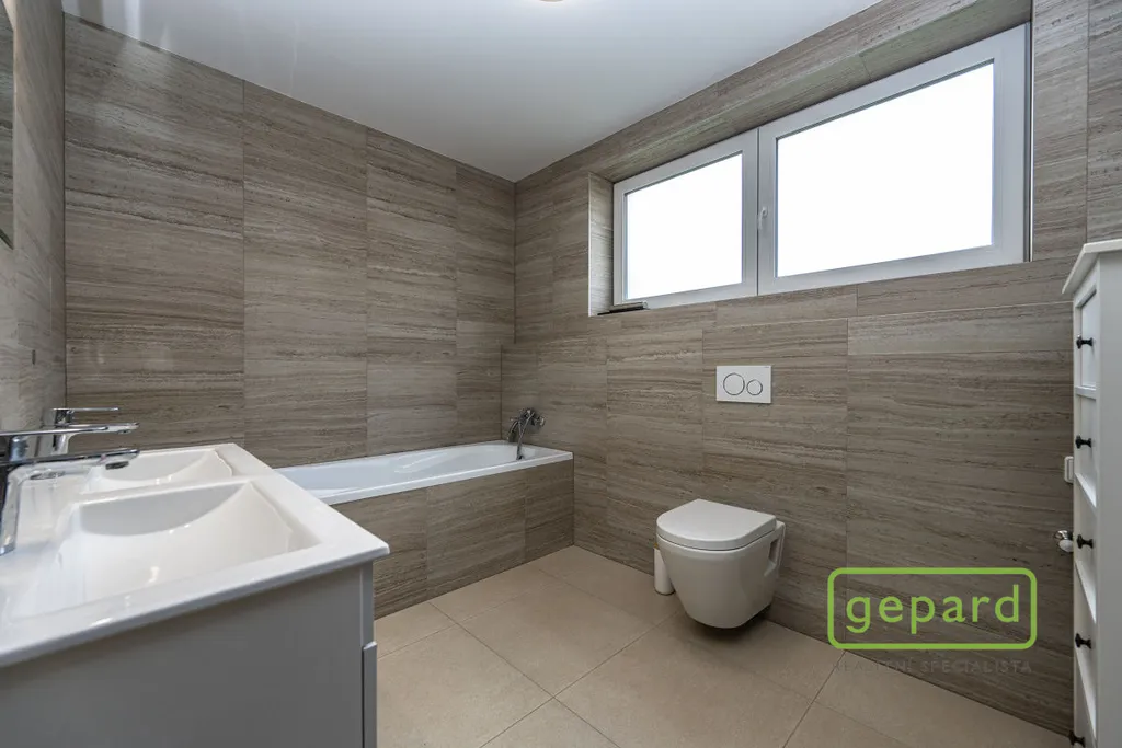 V přízemí je velká vstupní chodba s technickou místností, koupelna se sprchovým koutem a toaletou a prostorný obývací pokoj se zakázkovou kuchyňskou linkou vč. spotřebičů, dále pak jeden samostatný pokoj. V patře se nachází další tři samostatné pokoje (ložnice je s šatnou) a koupelna s vanou, dvojumyvadlem a toaletou. Všude jsou použité kvalitní materiály, velkoformátové dlažby a obklady v moderním designu. Zabezpečovací systém je od výrobce Jablotron s možností napojení na pult centrální ochrany.