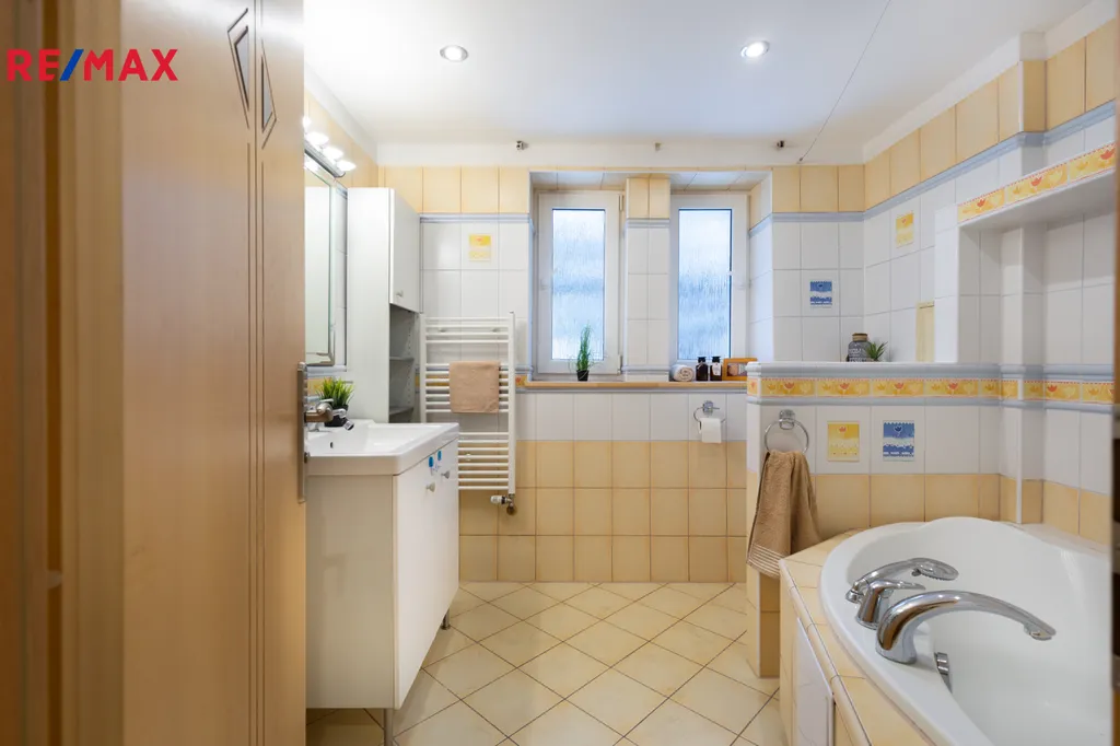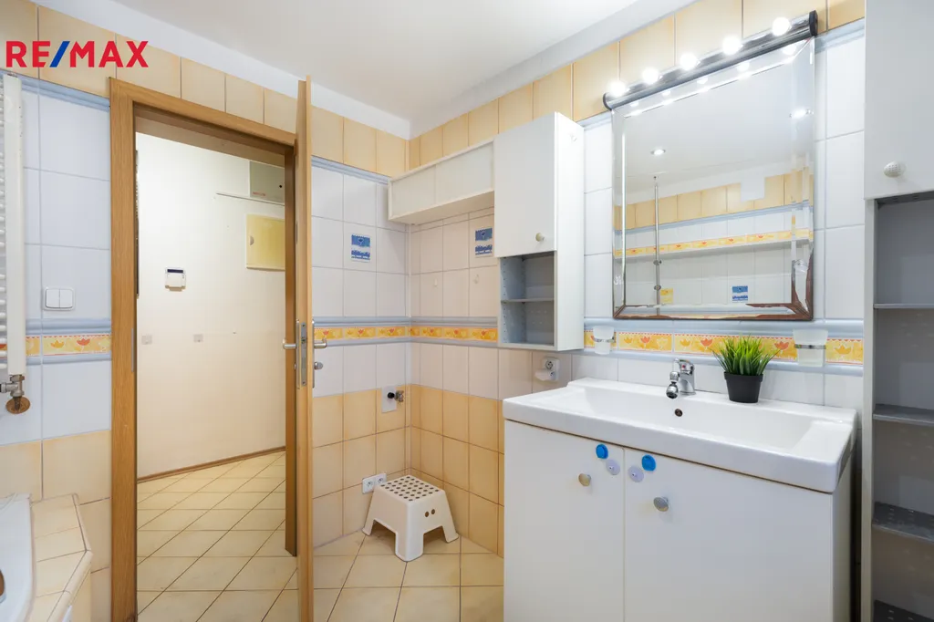 Koupelna je vybavena rohovou vanu pro pohodlnou relaxaci. Samozřejmostí je vstupní chodba s úložnými prostory.