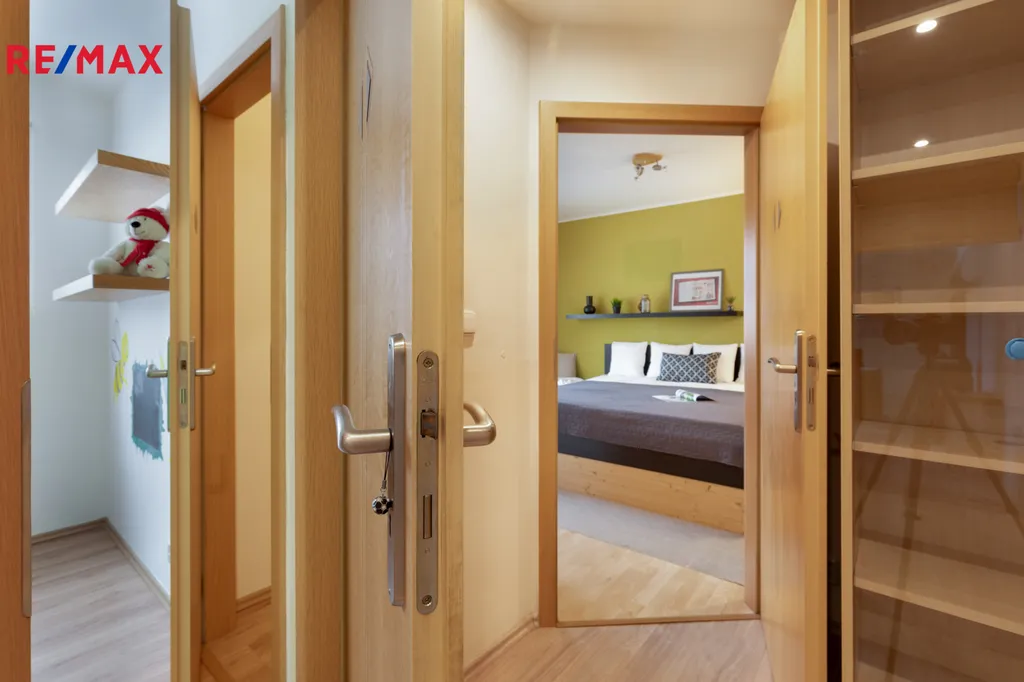 Ložnice a dětský pokoj jsou propojeny důmyslně řešenou šatnou. Prostorný obývací pokoj s jídelnou tvoří srdce bytu – místo pro rodinná setkání i klidné večery.