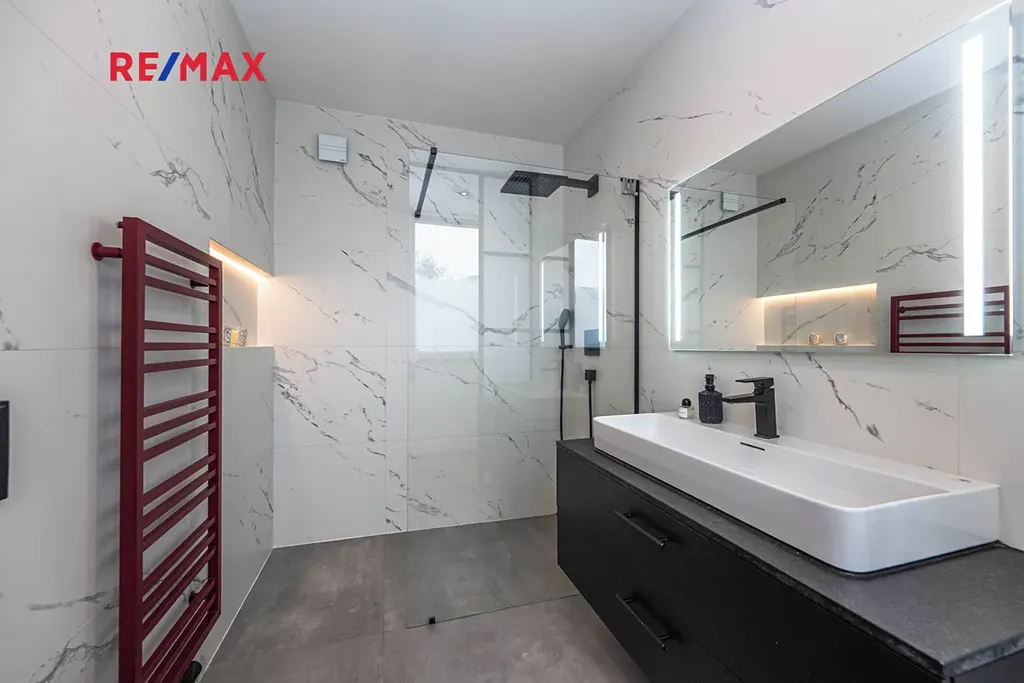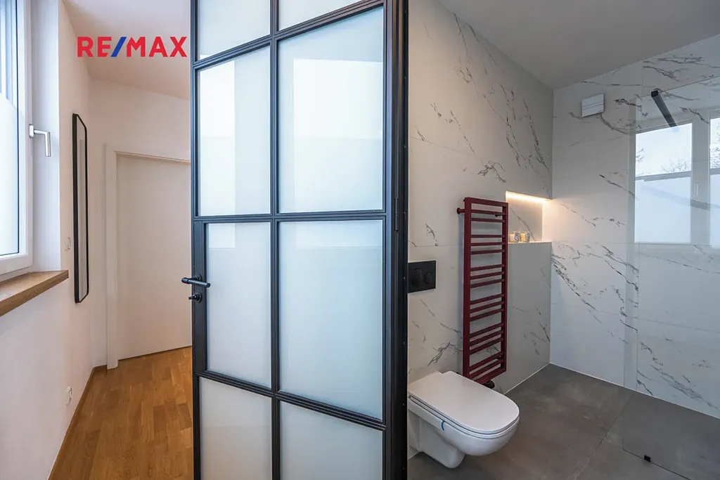 Nemovitost disponuje třemi designovými koupelnami, které jsou zařízeny nadstandardními zařizovacími prvky (HansGrohe, Laufen).