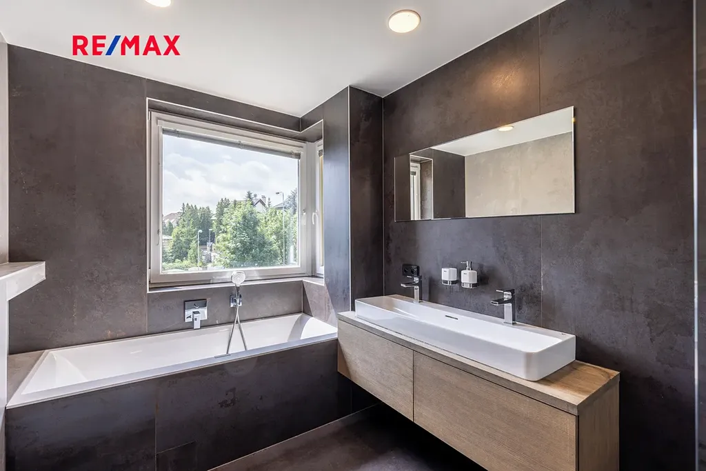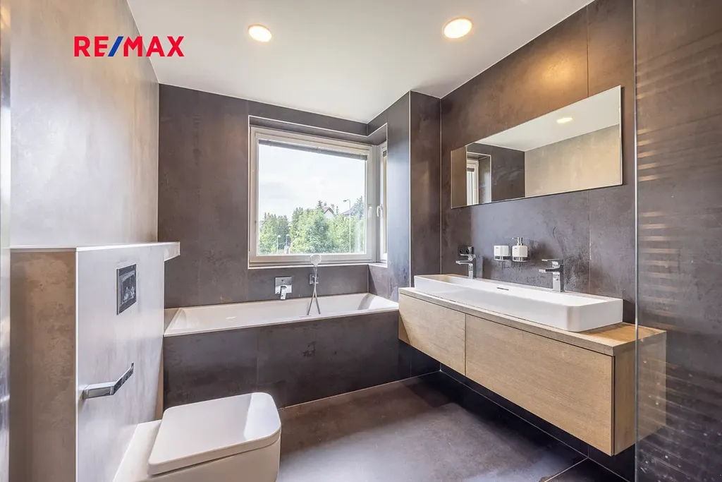 Koupelna kombinuje vanu, sprchový kout a WC a byla vybavena velkoformátovými obklady a dlažbou značky Villeroy & Boch. K dispozici je také samostatné WC a praktická technická místnost.