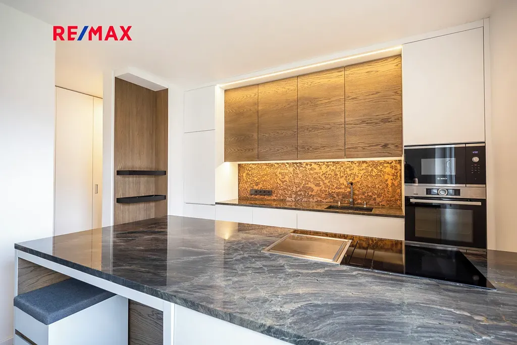 Dominantou bytu je světlý obývací pokoj s kuchyňským koutem, kde vás zaujme designová stěrka od společnosti Němec a kuchyňská linka na míru z dílny truhláře, osazená kamennou pracovní deskou. Kuchyňský ostrůvek je chytře řešený – zabudované židle lze pohodlně vysunout a zasunout, čímž šetří prostor a zvyšují praktičnost.