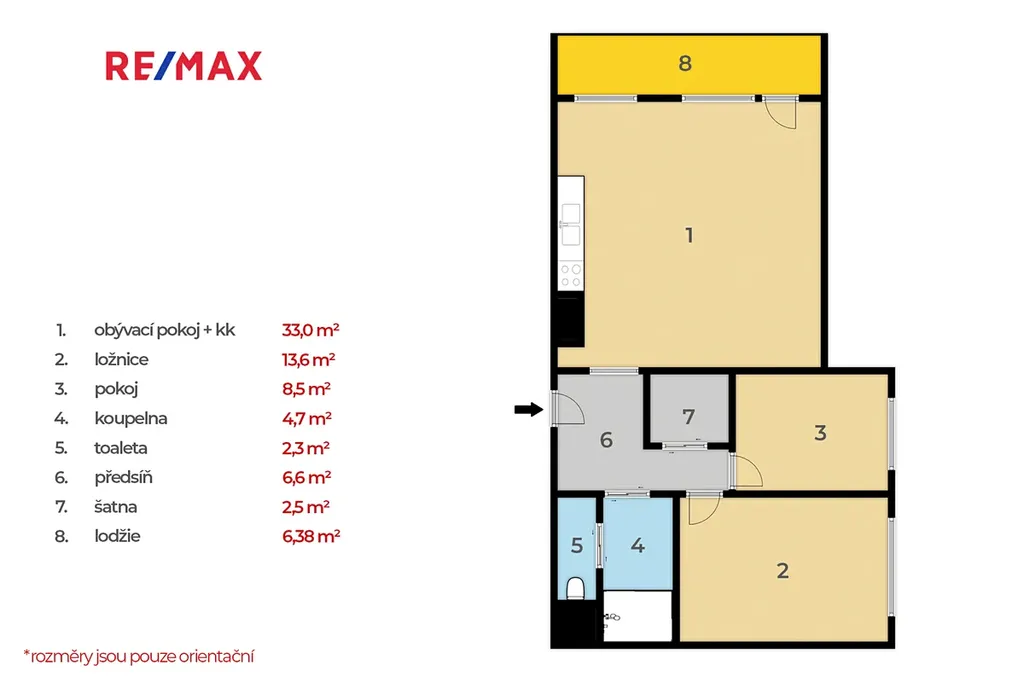 Orientace dle světových stran: Obývací pokoj je orientován na západ, ložnice a pokoj na sever.