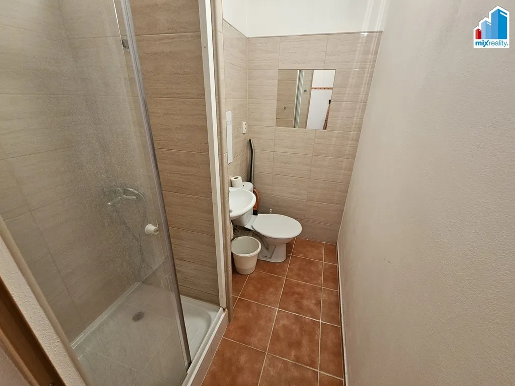 Dispozici tvoří předsíň, pokoj s kuchyňským koutem, koupelna se sprchovým koutem a WC.