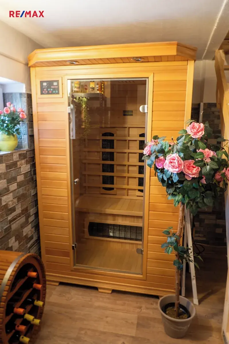 Dům má celkem 2 koupelny, je částečně podsklepený a nabízí i přístup na půdu z dílny a zadní místnosti se saunou.