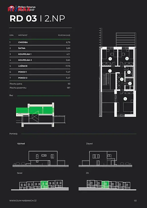 6 řadových domů o dispozici 4+kk s orientací zahrad směrem do stávající zástavby. Domy jsou dispozičně řešeny tak, aby umožňovaly plnohodnotné rodinné bydlení. Každý dům nabízí 145 m² čistě podlahové plochy a vlastní garáž v architektonicky jednotném bloku domů.