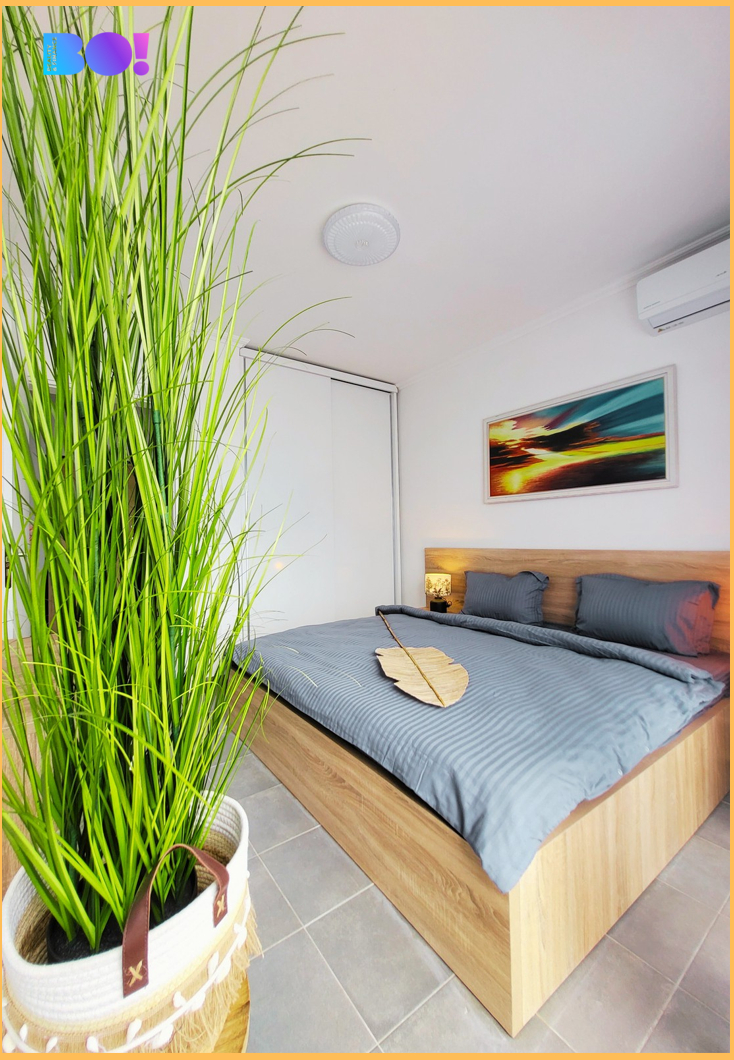 Dominantou bytu je světlý obývací prostor s plně vybavenou moderní kuchyní, která splňuje požadavky i náročnějšího uživatele – nechybí trouba, indukční deska, myčka, mikrovlnná trouba ani kávovar. Samostatná ložnice poskytuje maximální soukromí a komfort. Koupelna je vybavena sprchovým koutem, WC i bidetem. Samozřejmostí je klimatizace, WiFi, televize a kompletní vybavení pro okamžité užívání nebo pronájem bez dalších investic.