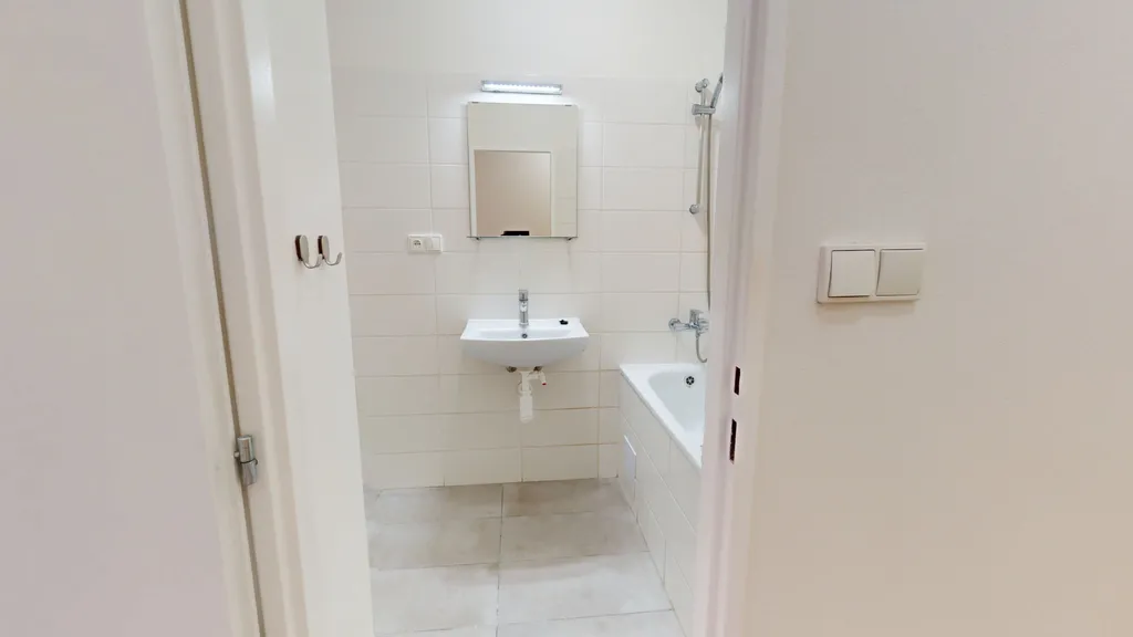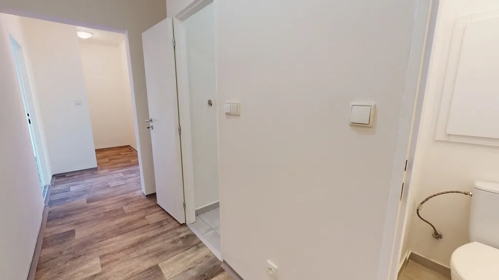 Byt má vyzděné jádro, podlahy, rozvody, omítky, interiérové dveře. Koupelna s vanou a umyvadlem s možností připojení pračky, toaleta je odděleně. Prostorná kuchyňská linka je opatřena plynovým sporákem a elektrickou troubou.