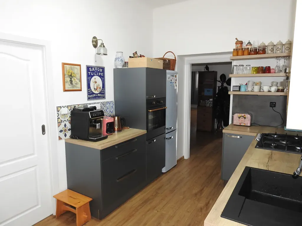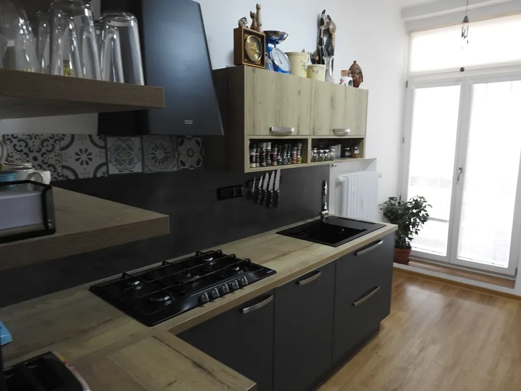 nová kuchyňská linka se značkovými vestavěnými spotřebiči ( plynový sporák s el, troubou, myčka, odsávač par ),