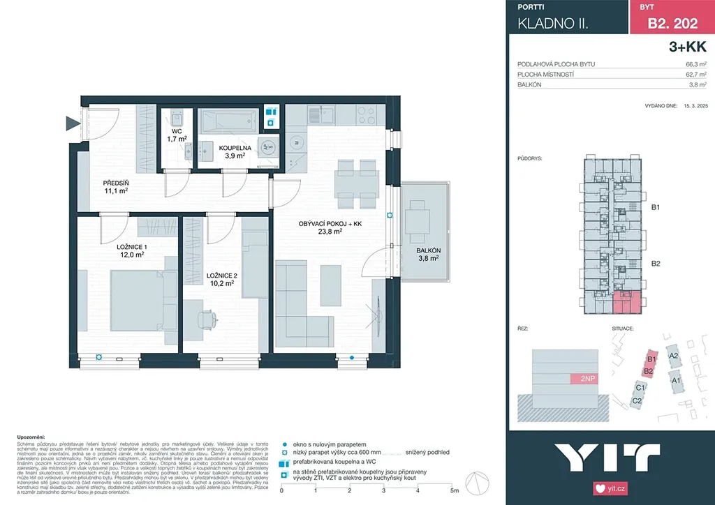 Byt 3+kk o celkové rozloze 66,3 m² s balkónem 3,8 m² je situován v 2.NP projektu PORTTI Kladno II. Cena zahrnuje bytovou jednotku, sklepní kóji a DPH. K bytu náleží i parkovací stání, které není zahrnuto v ceně. Cena parkovacího stání od 448 000 Kč včetně DPH.