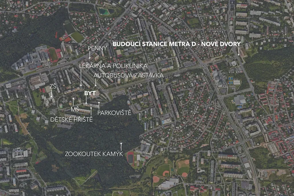 Zároveň tu máte vše potřebné pro běžný život. V docházkové vzdálenosti je Penny Market, další služby a větší nákupy pak řeší OC Novodvorská Plaza. Samozřejmostí jsou mateřské i základní školy, zdravotní péči zajišťuje mimo jiné Fakultní Thomayerova nemocnice. I pro sportovní vyžití je v okolí dostatek možností.