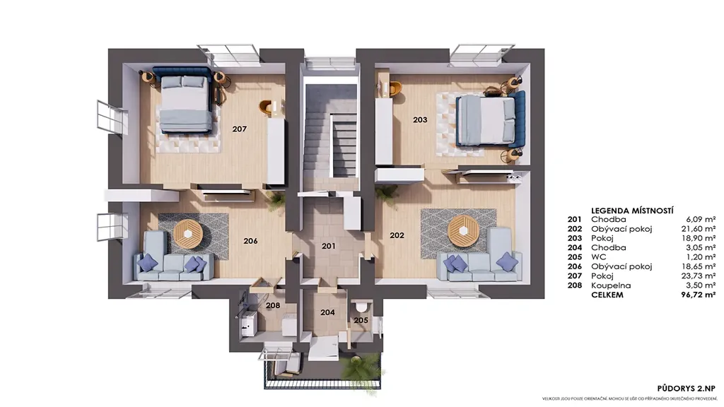 Dům je zároveň vhodný jako klasické rodinné sídlo pro větší rodinu nebo dvougenerační bydlení. Současná dispozice (4+1 v přízemí a 4+kk v patře) nabízí komfortní oddělení dvou domácností při zachování soukromí. Podkroví s dostatečnou světlou výškou umožňuje další rozšíření obytné části.