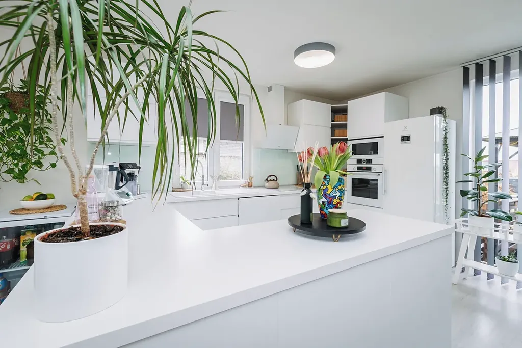 Dominantou domu je velkorysý a světlý obývací pokoj o velikosti 41,35 m² propojený s moderní kuchyní (7,91 m²) a přímým vstupem na terasu. Prostor je díky velkým oknům příjemně prosvětlený a působí velmi vzdušně.