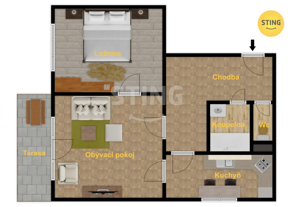 Obývací pokoj (18,06 m²) má přímý vstup na slunnou terasu (20 m²), kterou vám budou sousedé závidět.
