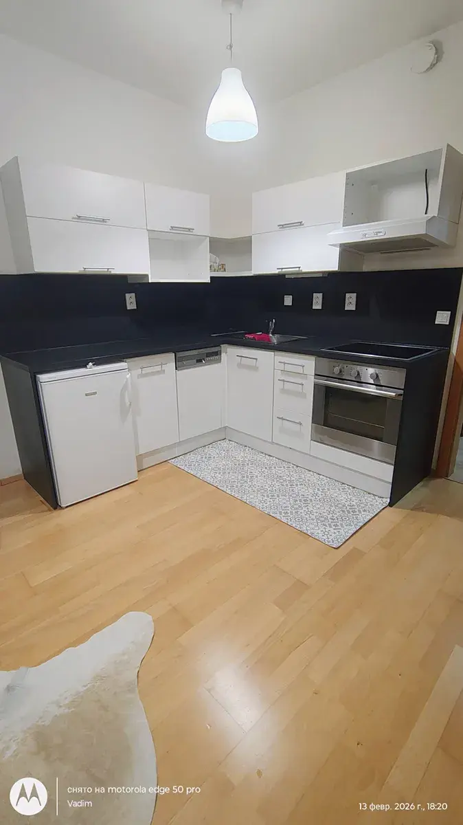 Kuchyňská linka je vybavena spotřebiči (varná deska, trouba, digestoř, lednice). V bytě je dostatek úložného prostoru díky vestavěné skříni.